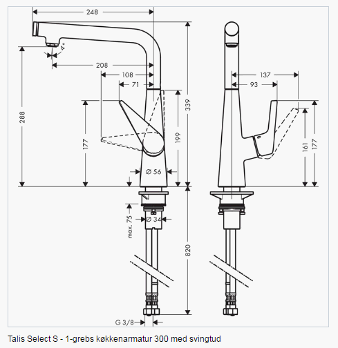 • Større bevægelsesfrihed: Armaturet er udstyret med en ekstra høj tud (ComfortZone 300). Svingningsområdet kan justeres i 3 trin (110°, 150° eller 360°)