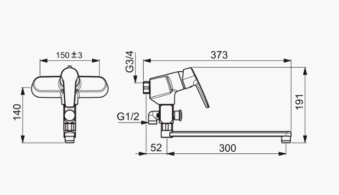 Vægarmatur med svingtud (300 mm). Mulighed for begrænsning af temperatur og vandmængde.