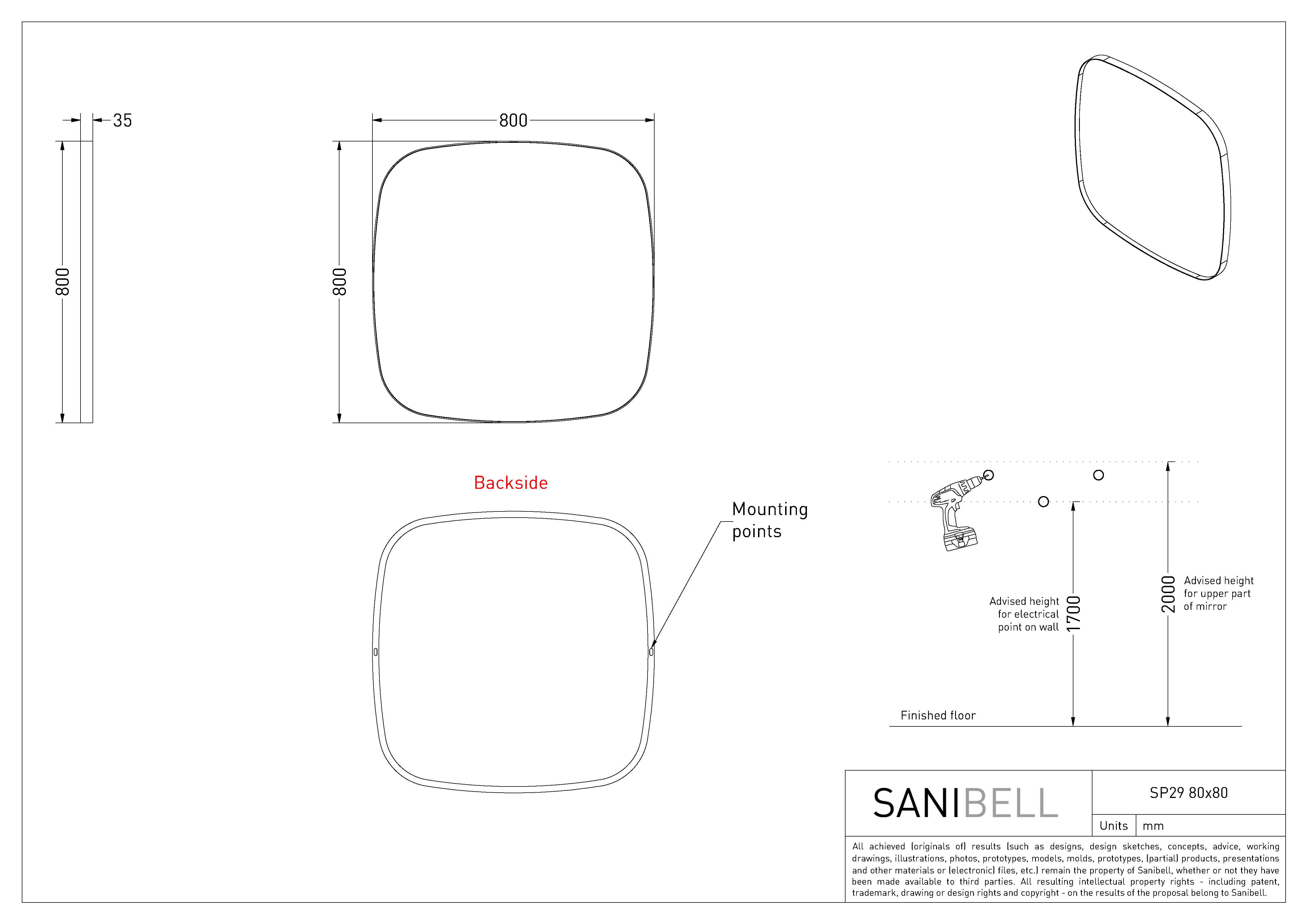 Minimalistisk spejl med ramme, som forfra er helt slank, men fra siden træder frem fra spejlets profil. Formen er superellipse og dermed ikke helt rund, og ikke helt firkantet.
