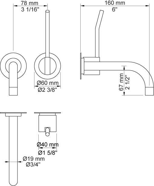 Vola Et-grebsblander med keramisk ventilenhed og fast afgangsmuffe Fast udløb, 160 mm, ø19 mm Langt 100 mm Rosetter Krom 16 ½''RG/PEX