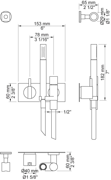Et-grebsblander med keramisk ventilenhed 100, håndbruser og holder med kontraventil 070, to-hulsplade 60 x 153 mm 3002, håndbruserholder T9.